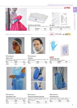 Cuffi a clip in PLP. 14 gr/m2. Doppio elastico. Plissettata. Ø Copribarba in PLP, 12 gr/m2. Elastico nucale. Anatomico. DPI I Guanti in nitrile sterili