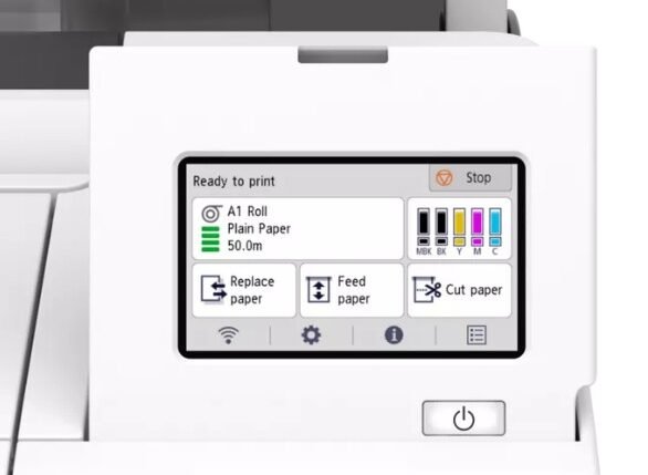 Design funzionale con pannello touch screen sulla stampante che visualizza istruzioni intuitive e informazioni importanti come il tipo di supporto, la quantità di supporto e l'inchiostro rimanente. Il rotolo di carta può essere sostituito con facilità attraverso il coperchio piatto.